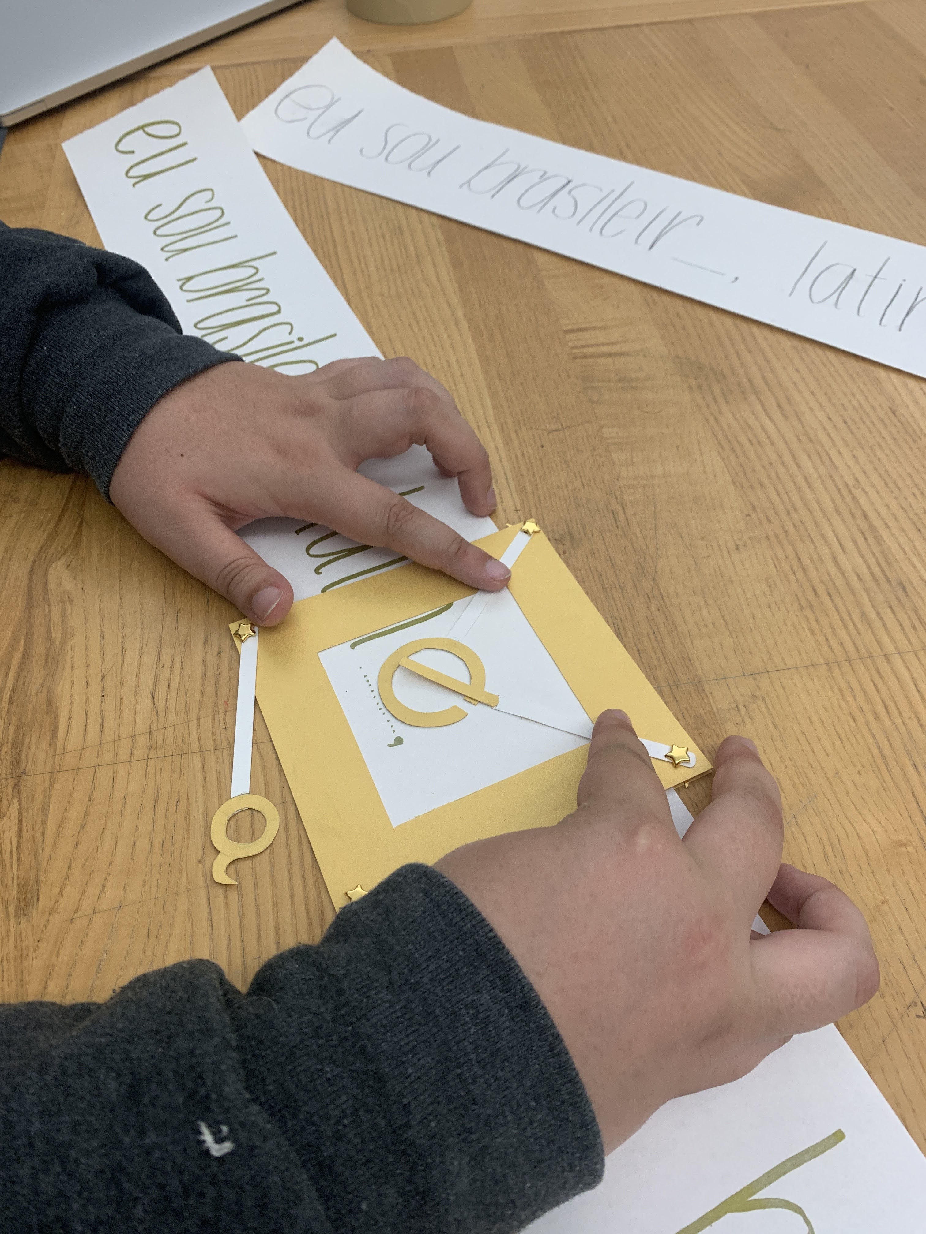 It is unclear exactly when people first began to modify the gendered aspects of Portuguese, but it has begun to gain some popularity in recent years, primarily in queer communities, without any significant wider recognition. The most common modifications are replacing the gendered -o or -a with -@, -x, and -e. I chose to explore all of these endings in a unique art book form I invented. You can slide the gold square across the sentence and move the arms to modify the endings of the words, making them feminine, masculine, or gender neutral.